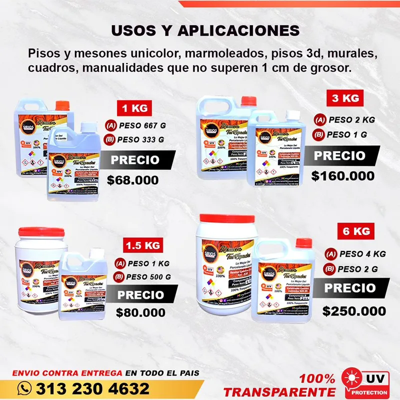 Uso y aplicaciones: Pisos y mesones unicolor, marmoleados, pisos 3D, murales, cuadros, manualidades que no superen 1 cm de grosor.